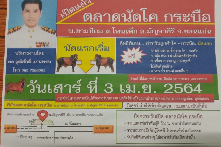 ตลาดนัดโค กระบือ บ้านป้อม ต.โพนเพ็ก อ.มัญจาคีรี จ.ขอนแก่น By admin15 มีนาคม 2021 เปิดให้บริการทุ… อ่านเพิ่มเติม